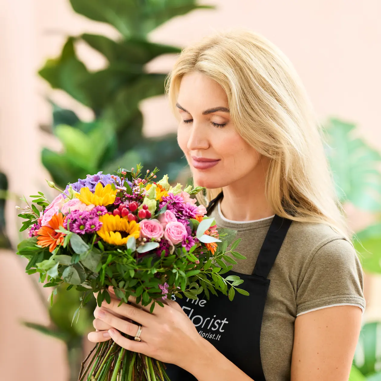 Floristo fantazija – tai unikalus gėlių derinys, sukurtas išlaisvinti kūrybiškumą. Kiekviena detalė atspindi sezono spalvas ir aromatus. Tai spalvingas gėlių derinys kiekvienai dienai. Nuotrauka yra pavyzdinė – kiekviena puokštė kuriama individualiai, tačiau išlaikant spalvų gamą ir koloritą. Puokštė skirta pasveikinti ar nustebinti mylimus žmones, kolegas bei draugus bet kuria proga. Pridedamas NEMOKAMAS atvirukas. Visos gėlių kompozicijos komponuojamos išskirtinai iš šviežių gėlių. Gėlių pristatymas yra NEMOKAMAS Vilniaus mieste. Nuotraukoje pavaizduota vidutinio dydžio gėlių puokštė.