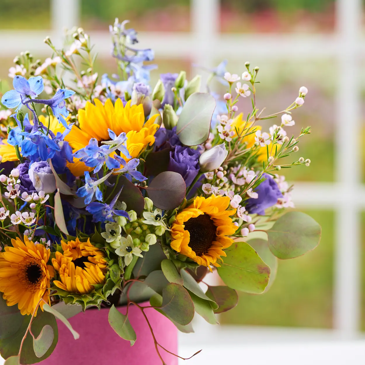 Gėlės dėžutėje – tai labai patogus, modernus ir šiuolaikiškas sprendimas. Dėl originalumo, stiliaus ir praktiškumo, šis gėlių pateikimas yra vienas iš populiariausių pasaulyje. Gėlių dėžutės kompoziciją sudaro violetinės spalvos eustomos, paukštpienė, sodriai mėlynos spalvos delphinium. Saulėgrąžos bei geltonos spalvos gerberos. Visos šios gėlės įkomponuotos kartu su vaškagėle bei eukalipto šakelėmis. Kompozicija pateikiama rožinės spalvos dėžutėje. Puokštė skirta pasveikinti ar nustebinti mylimus žmones, kolegas bei draugus bet kuria proga. Pridedamas NEMOKAMAS atvirukas. Atminkite, jog kiekviena puokštės kompozicija – tobulas meno kūrinys. Tam tikrais atvejeis dėl sezoniškumo, jeigu nėra tam tikros rūšies gėlės/-ių, pavaizduoto/-ų nuotraukoje, floristas turi teisę pakeisti gėlę/-es į kitas, išlaikant tokią pačią spalvų gamą ir stilistiką. Visos gėlių kompozicijos komponuojamos išskirtinai iš šviežių gėlių. Gėlių pristatymas yra NEMOKAMAS Vilniaus mieste. Nuotraukoje pavaizduota didesnio dydžio gėlių dėžutė.