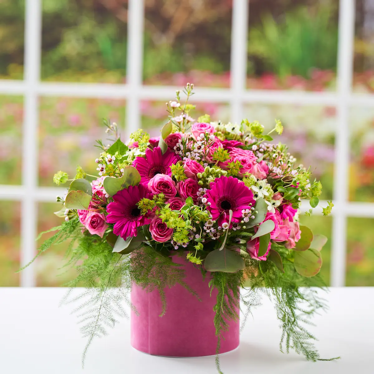 Gėlės dėžutėje – tai labai patogus, modernus ir šiuolaikiškas sprendimas. Dėl originalumo, stiliaus ir praktiškumo, šis gėlių pateikimas yra vienas iš populiariausių pasaulyje. Gėlių dėžutės kompoziciją sudaro rožinės spalvos gerberos, rožinės smulkiažiedės rožės, vaškagėlė bei paukštpienė. Visos šios gėlės įkomponuotos kartu su žalumynais bupleurum, asparagus bei eukalipto šakelėmis. Kompozicija pateikiama rožinės spalvos dėžutėje Puokštė skirta pasveikinti ar nustebinti mylimus žmones, kolegas bei draugus bet kuria proga. Pridedamas NEMOKAMAS atvirukas. Atminkite, jog kiekviena puokštės kompozicija – tobulas meno kūrinys. Tam tikrais atvejeis dėl sezoniškumo, jeigu nėra tam tikros rūšies gėlės/-ių, pavaizduoto/-ų nuotraukoje, floristas turi teisę pakeisti gėlę/-es į kitas, išlaikant tokią pačią spalvų gamą ir stilistiką. Visos gėlių kompozicijos komponuojamos išskirtinai iš šviežių gėlių. Gėlių pristatymas yra NEMOKAMAS Vilniaus mieste. Nuotraukoje pavaizduota didesnio dydžio gėlių dėžutė.