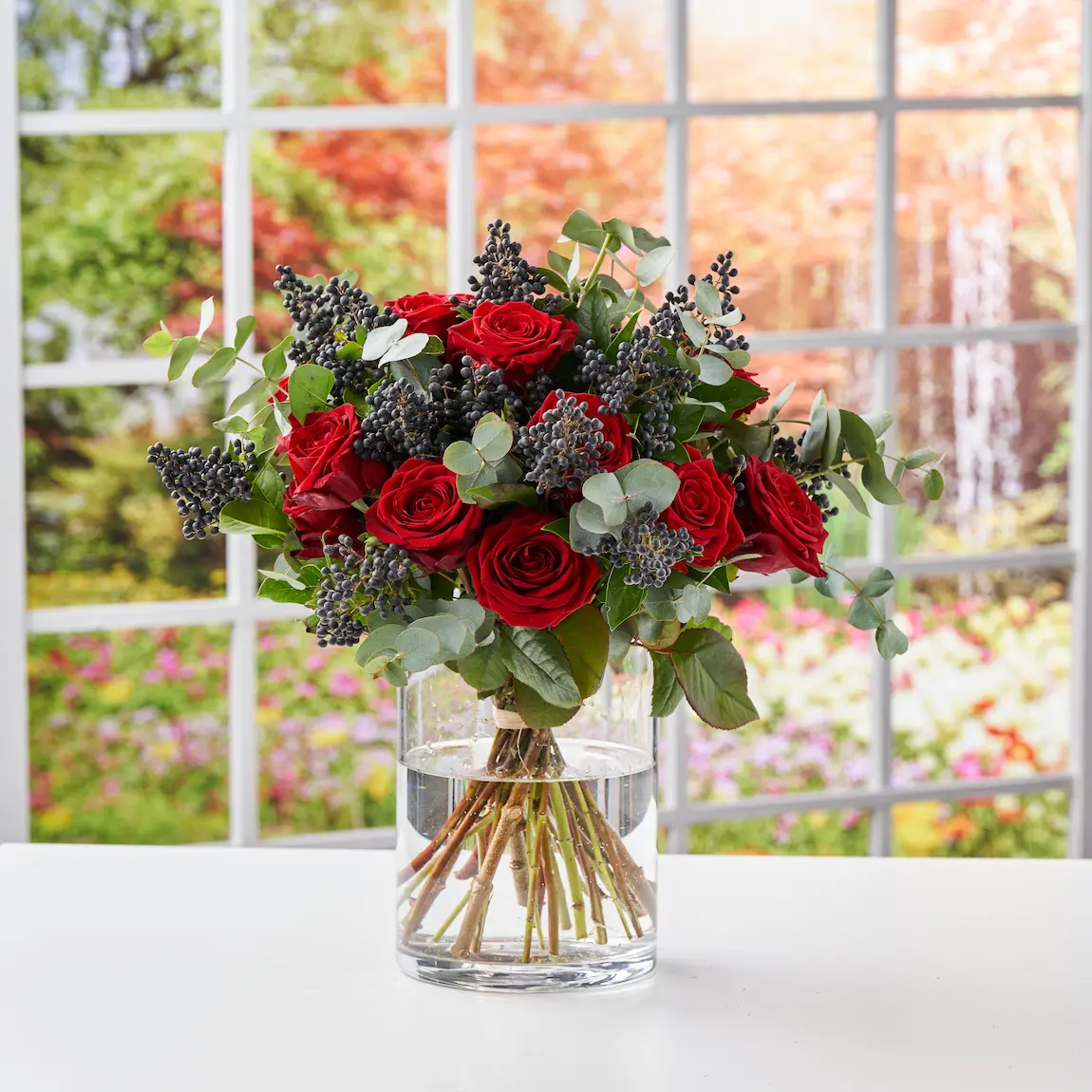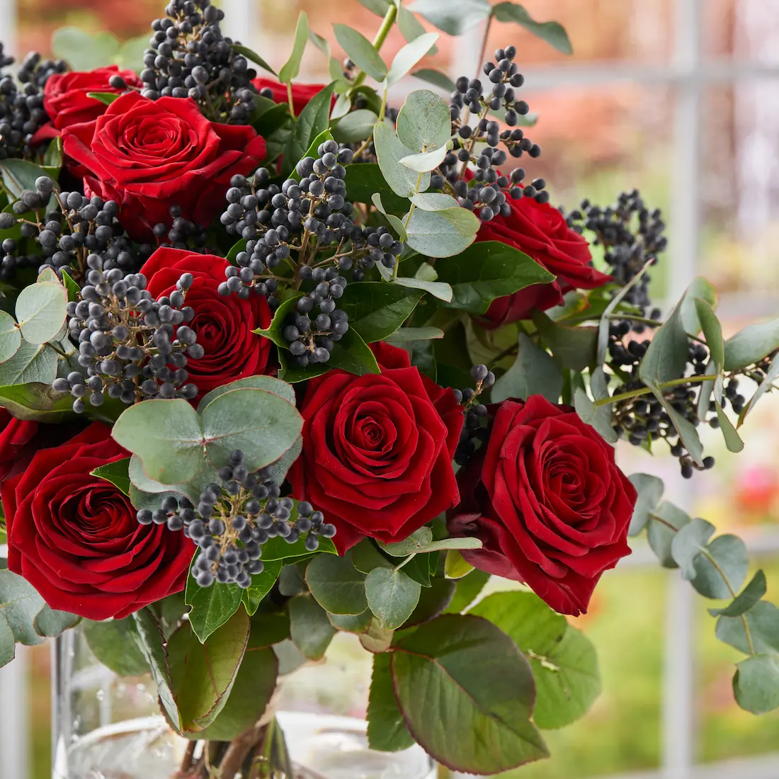 Puokštė sukomponuota iš tamsesnių spalvos gėlių žiedų. Įterpus žalumynus gėlių puokštė tampa ryškesnė ir kontrastingesnė. Nuotraukoje pavaizduota vidutinio dydžio puokštė. Kompoziciją sudaro tokios gėlės kaip “Premium” klasės “Red Naomi” raudonos rožės, juodos uogų šakelės ligustrum bei kvepiantis eukaliptas. Puokštė skirta pasveikinti ar nustebinti mylimus žmones, kolegas bei draugus bet kuria proga. Pridedamas NEMOKAMAS atvirukas. Atminkite, jog kiekviena puokštės kompozicija – tobulas meno kūrinys. Tam tikrais atvejeis dėl sezoniškumo, jeigu nėra tam tikros rūšies gėlės/-ių, pavaizduoto/-ų nuotraukoje, floristas turi teisę pakeisti gėlę/-es į kitas, išlaikant tokią pačią spalvų gamą ir stilistiką. Visos gėlių kompozicijos komponuojamos išskirtinai iš šviežių gėlių. Gėlių pristatymas yra NEMOKAMAS Vilniaus mieste. Priklausomai nuo sezoniškumo kompozicijoje bus naudojimos Ligustrum/Viburnum/Hedera uogų šakelės. Nuotraukoje pavaizduota vidutinio dydžio gėlių kompozicija.