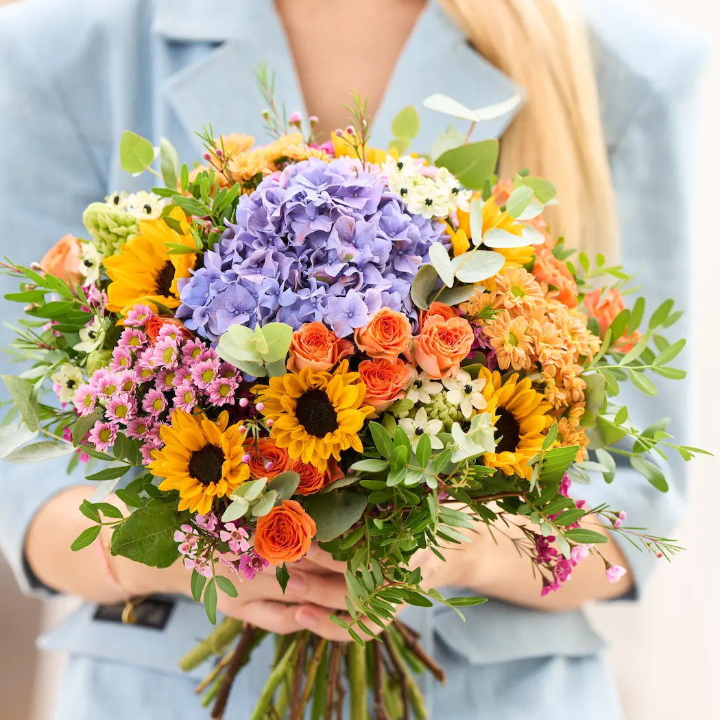 Kompoziciją sudaro tokios skintos gėlės kaip saulėgrąžos, oranžinės spalvos smulkiažiedės rožės, hortenzija, įvairiaspalvės smulkiažiedės chrizantemos, paukštpienės bei vaškagėlė. Visa tai sukomponuota kartu su pistacija bei eukalipto šakelėmis.