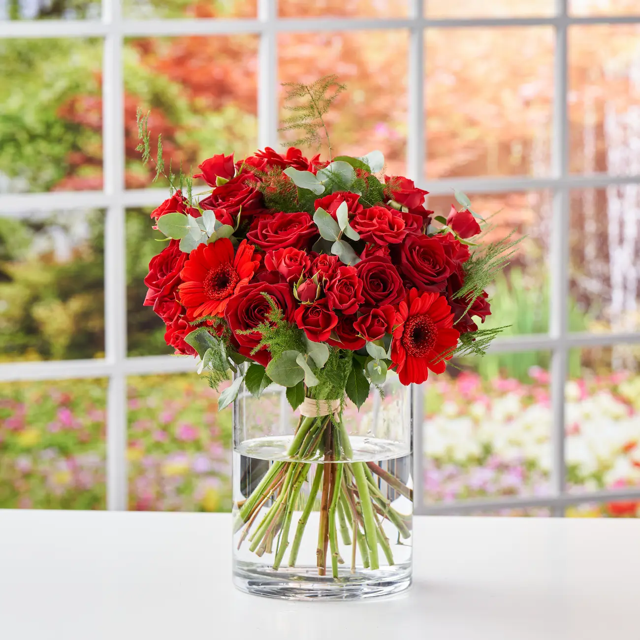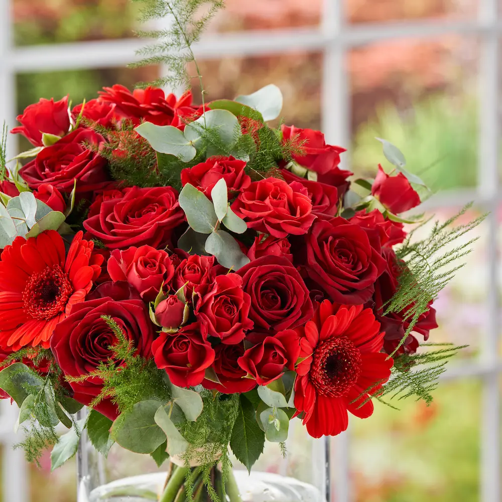Puokštė sukomponuota iš įvairių raudonos spalvos žiedų. Kompozicijoje dominuoja raudona spalva. Kartu šviesesniais bei tamsesniais atspalviais išlaikomas puokštės spalvų vientisumas. Kompoziciją sudaro tokios gėlės kaip raudonos rožės, raudonos spalvos smulkiažiedės, raudonos gerberos, įterpiant žalumynus asparagus bei eucalipto šakeles. Puokštė skirta pasveikinti ar nustebinti mylimus žmones, kolegas bei draugus bet kuria proga. Pridedamas NEMOKAMAS atvirukas. Atminkite, jog kiekviena puokštės kompozicija – tobulas meno kūrinys. Tam tikrais atvejeis dėl sezoniškumo, jeigu nėra tam tikros rūšies gėlės/-ių, pavaizduoto/-ų nuotraukoje, floristas turi teisę pakeisti gėlę/-es į kitas, išlaikant tokią pačią spalvų gamą ir stilistiką. Visos gėlių kompozicijos komponuojamos išskirtinai iš šviežių gėlių. Gėlių pristatymas yra NEMOKAMAS Vilniaus mieste. Nuotraukoje pavaizduota vidutinio dydžio gėlių kompozicija.